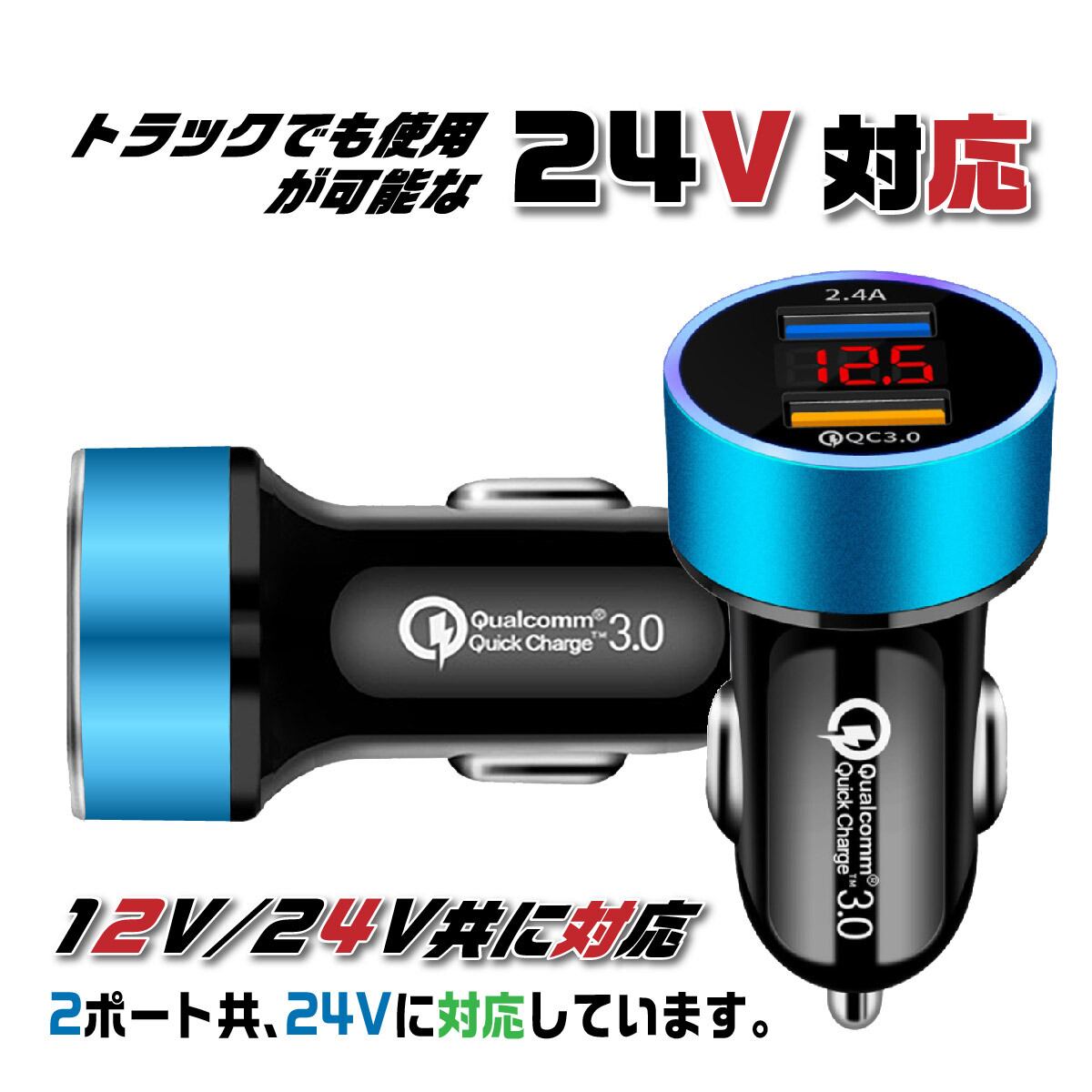 シガーソケット USB カーチャージャー 2連 2ポート QC3.0 増設 小型 LED 急速充電 電圧計 iPhone 車内 トラック 12V 24V